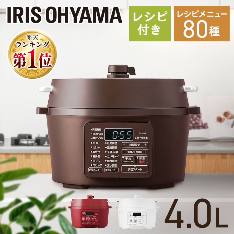 電気圧力鍋 4L アイリスオーヤマ圧力鍋 電気 圧力電気鍋 圧力なべ グリル鍋 タイマー機能付 3〜4人 自動メニュー搭載 低温調理 時短 簡単操作 保温 大容量 簡単 お手軽 時短 一人暮らし 家族 送料無料 PC-MA4-W/R/T