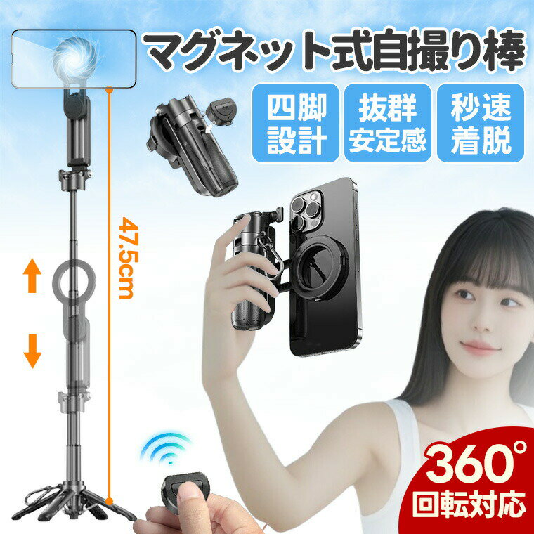 ご注意1、iPhone 12/13/14/15/16シリーズはマグネットリングは不要です。2、その他の機種は、Magsafe対応ケースやマグネットリングが必要です。(スマホ本体にマグネットリングの貼り付けはおすすめしません、メッキ剥がれやキズの原因となります。)【製品仕様】商品名:マグネット式自撮り棒商品パッケージ:スタンド本体*1、リモコン*1【マグネットホルダー 】2025年最新"MagSafe"自撮り棒スマホを固定する部分が強力マグネットへ進化して、置くだけスマホを“ピタッ”と簡単装着!【軽量& コンパクト】軽量コンパクトで持ち運びラクラク外出先や、旅行にも気軽に持って行けます。【縦横自由自在】横画面と縦画面両方の撮影はもちろん、斜め上から角度で撮影もできます。ご注意1、iPhone 12/13/14/15/16シリーズはマグネットリングは不要です。2、その他の機種は、Magsafe対応ケースやマグネットリングが必要です。(スマホ本体にマグネットリングの貼り付けはおすすめしません、メッキ剥がれやキズの原因となります。)【製品仕様】商品名:マグネット式自撮り棒商品パッケージ:スタンド本体*1、リモコン*1【マグネットホルダー 】2025年最新"MagSafe"自撮り棒スマホを固定する部分が強力マグネットへ進化して、置くだけスマホを“ピタッ”と簡単装着!【軽量& コンパクト】軽量コンパクトで持ち運びラクラク外出先や、旅行にも気軽に持って行けます。【縦横自由自在】横画面と縦画面両方の撮影はもちろん、斜め上から角度で撮影もできます。