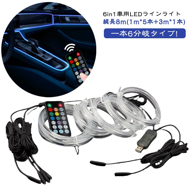 6in1車用LEDラインライト 総長8m(1m*5本+3m*1本)USB給電/光量調整/調色可能/音楽連動/リモコン操作一本6分岐タイプ! 車内の雰囲気をアップさせる!LEDラインライト/カラフルなRGBライトで車内の雰囲気を盛り上げるライトです。透過率の高い材質透過率の高い光ファイバーを使用し、 一つのLEDチップなのに、 光ファイバーの末端まできれいに輝きます。※光ファイバーで伝送される光は柔...
