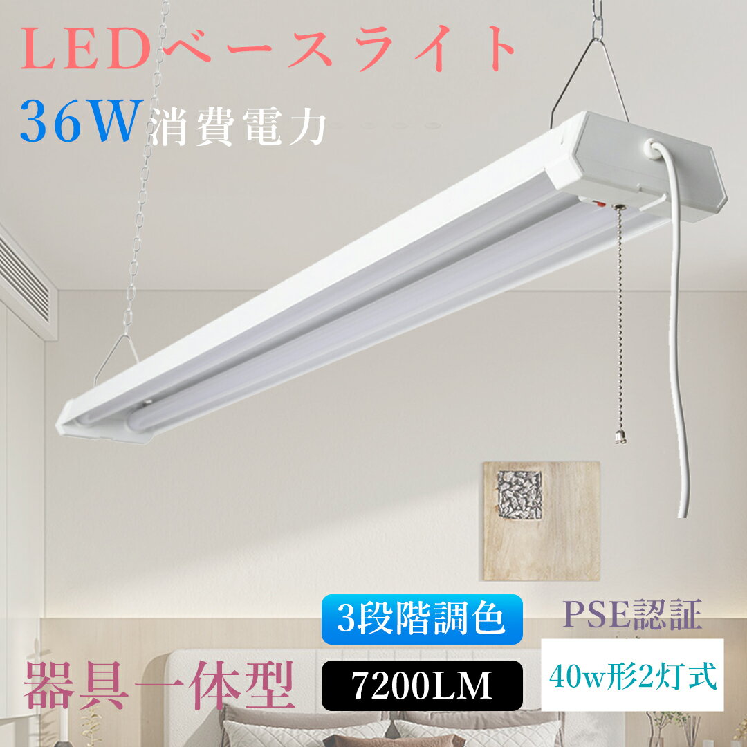 ■【驚きの価格&5倍ポイント】 ledベースライト 吊り下げ 36W 器具一体型 プルスイッチ LED蛍光灯 40W型2灯相当 7200lm 3段階調色 電球色 昼白色 昼光色 キッチンライト 連結可能 シーリングライト ACプラグ付 簡単取付 天井照明 施設照明 店舗照明 2年保証