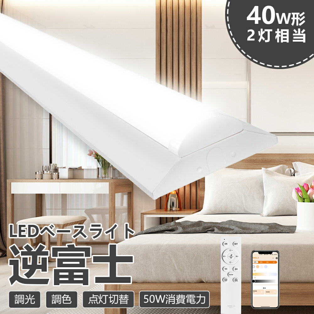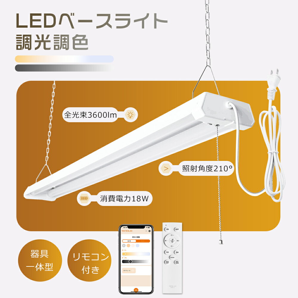 ■【2台セット】 LEDベースライト 40W型 2灯相当 調光 調色 プルスイッチ付き スマートライト 36W 4000LM リモコン付き スマホ操作 LED蛍光灯 40W形 直管 キッチンベースライト シーリングライト 器具一体型 吊下げ式 常夜灯 オフィス 学校 ガレージ 会議室 簡単取付 工事不要