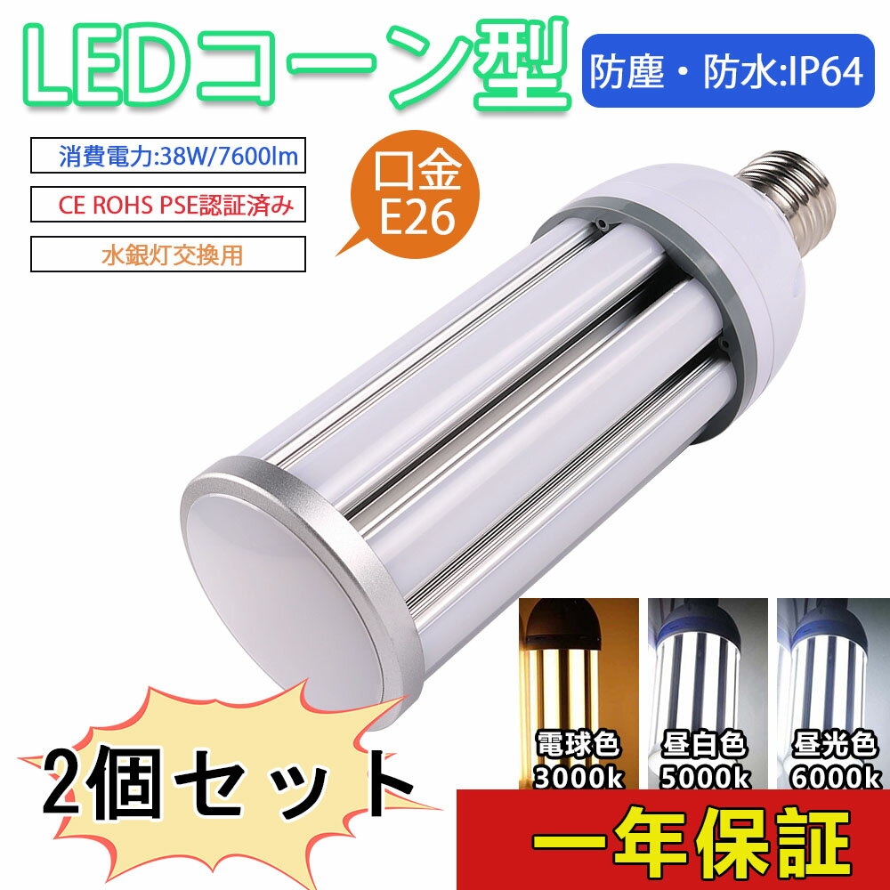 ■LEDコーンライト コーン型水銀灯 E39 E26 LED電球 300W水銀灯相当 消費電力38w 7600LM IP64防水防塵 密閉容器対応 コーン型LED照明 屋内 屋外 360°発光 水銀灯からledへ交換 電源内蔵 簡単取付 ハロゲン電球 天井照明 倉庫 工場 街路灯 防犯灯 色選択 一年保証 2個セット