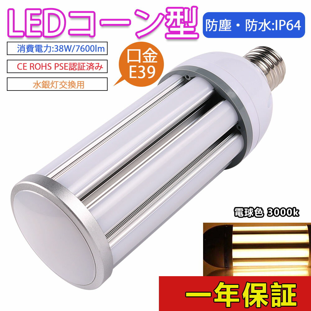 ■水銀灯 LED e39 ソケット LED電球 e39 省エネ 電源内蔵 LED水銀ランプ ハロゲン電球 照明器具交換可能 簡単取付 おしゃれコーンライト LED コーンライト コーン型水銀灯 E39 LED電球 水銀灯交換用 明るい7600LM E39口金 38W 電球色 IP64 防水 防塵 電球色3000k