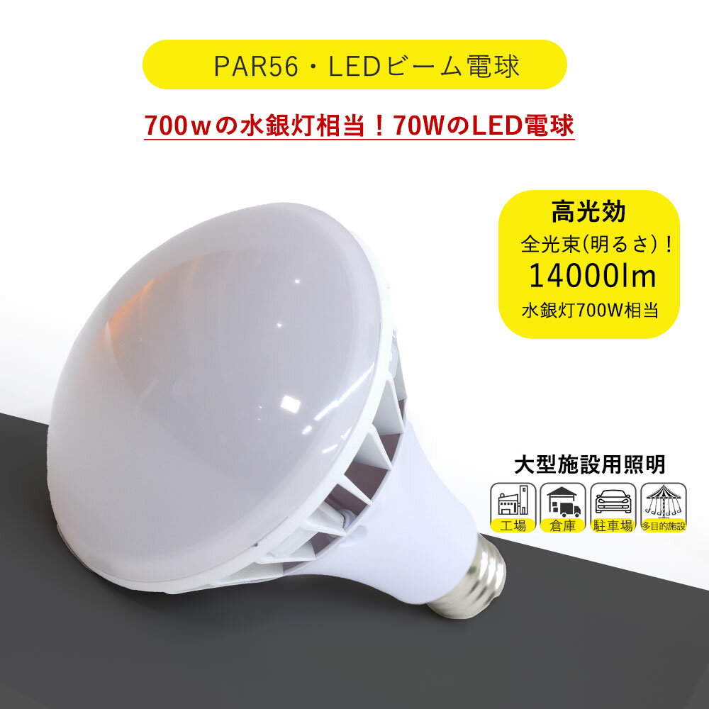■PAR56 LEDバラストレス水銀灯 ハロゲン電球 LEDスポットライト ledビーム電球 700w水銀灯相当 70w消費電力 高輝度 全光束 14000lm 照射角140° 防水・防塵 IP65 点灯遅延無し 簡単取付可能 口金直径39mm 高演色性 Ra85 高天井照明 看板照明 倉庫照明 作業灯 PSE認証済