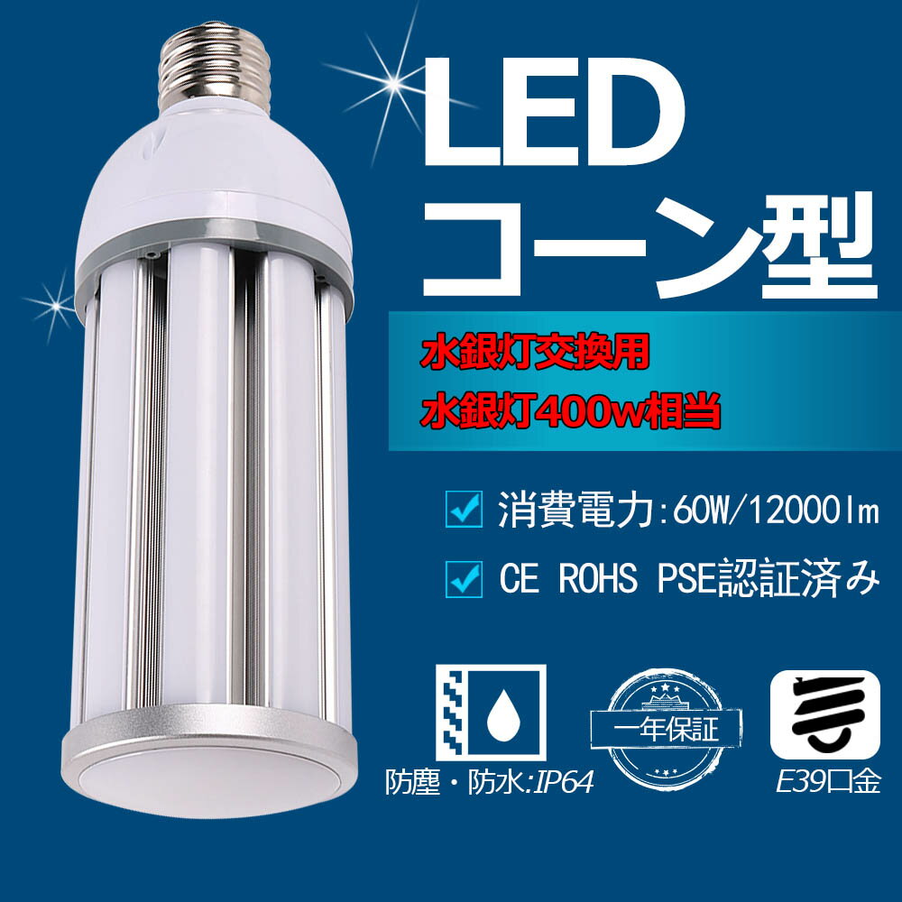 ■60w led PSE適合製品 色選択 コーン型 led電球 led 水銀灯 コーンライト 防水 天井照明 街路灯 密閉型器具対応 屋内外兼用 400W水銀灯相当 水銀灯代わり led電球 60w LED水銀ランプ ハロゲン電球 照明器具交換可能 簡単取付 LED コーンライト コーン型水銀灯 E39 LED電球