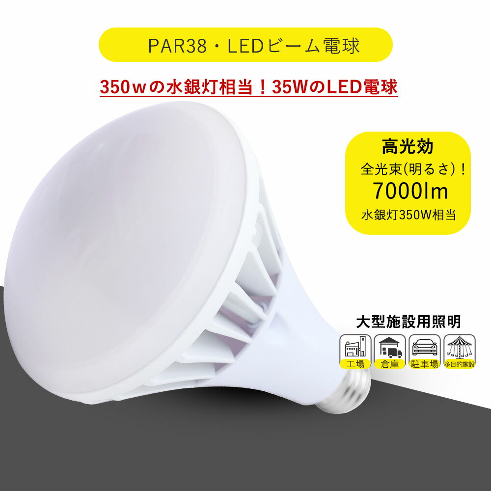 ■PAR38 LEDバラストレス水銀灯 ハロゲン電球 LEDスポットライト ledビーム電球 350w水銀灯相当 35w消費電力 高輝度 全光束 7000lm 照射角140° 防水・防塵 IP65 点灯遅延無し 簡単取付可能 口金直径26mm 高演色性 Ra85 高天井照明 看板照明 倉庫照明 作業灯 PSE認証済