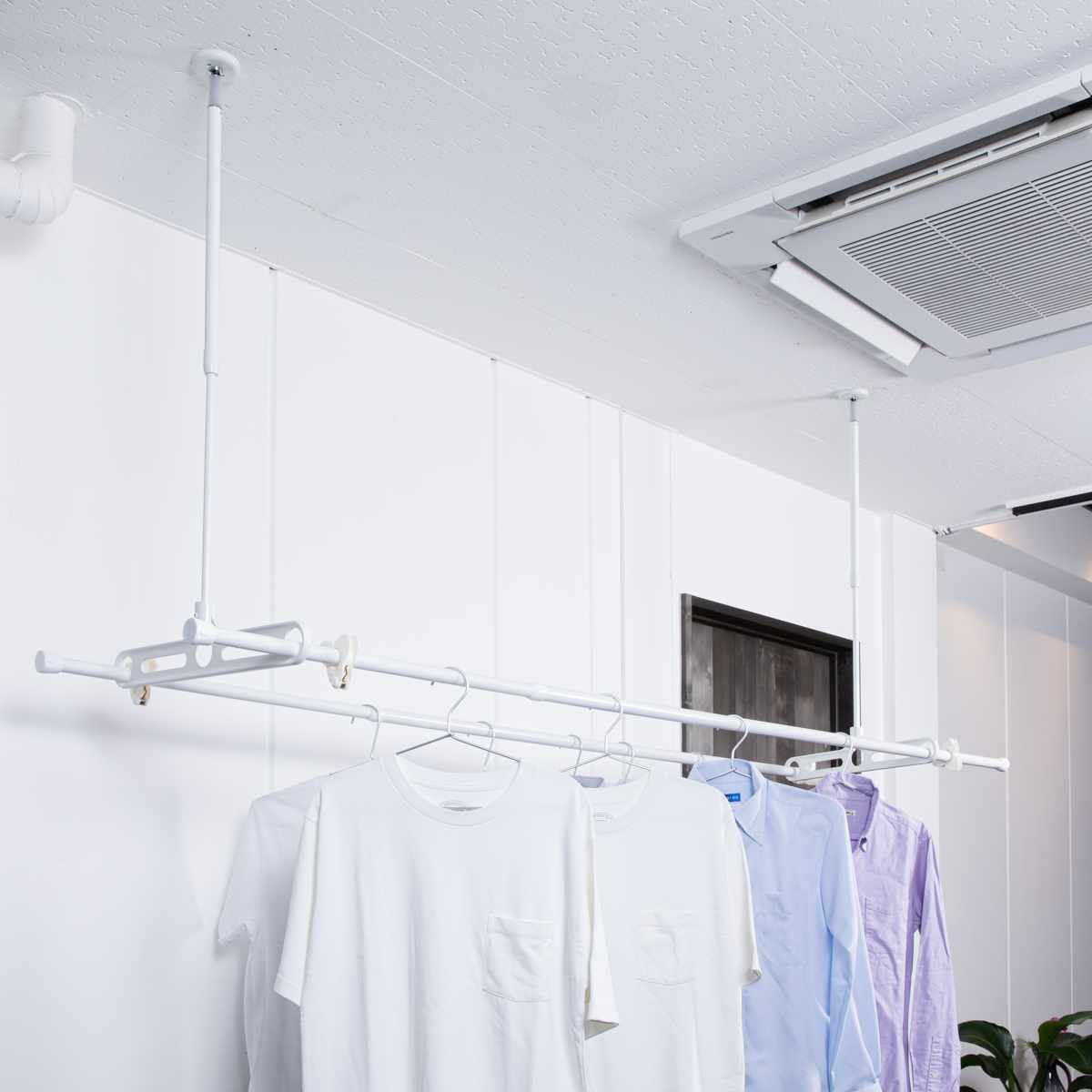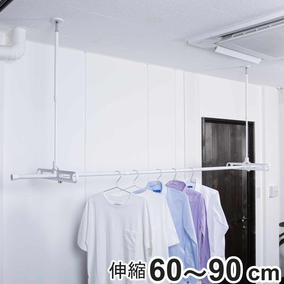 ■室内物干し 天吊り室内物干し 物干し DRY・WAVE 長さ60cm~90cm ( 吊下型室内物干し 竿なし 伸縮 2本 アーム付き ドライ・ウェーブ 吊り下げ 日本製 高さ調節 天井 簡単取付 60~90 ワイド設計 壁用フック付き 収納 ホワイト )【3980円以上送料無料】